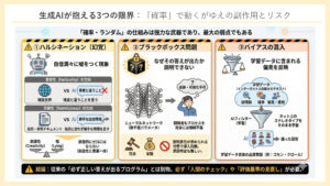 生成AIの基礎的なメカニズムや企業での活用事例に加え、ハルシネーションが原理的に発生する理由など、技術の特性について解説しました。 -